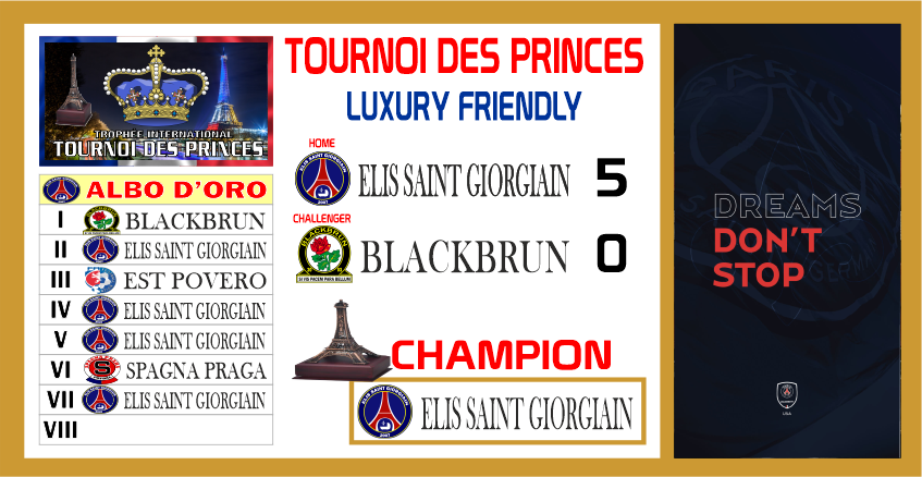 Và agli archivi la 7° edizione del Tournoi des Princes e sarà un torneo che passerà alla storia. Di fronte i padroni di casa dell'ESG e gli sfidanti del Blackbrun che hanno già vinto il torneo dei principi alla primissima edizione. Il risultato è sconvolgente, un ESG affamato di vittoria dinanzi ai propri trofei rifila una sonora lezione ai gialloneri inglesi: il 5-0 è il risultato più roboante mai registrato in un trofeo personale. Per l'ESG si tratta della quarta affermazione nella storia nel proprio trofeo e fanno particolarmente comodo i 3 Milioni del premio ad una società particolarmen...