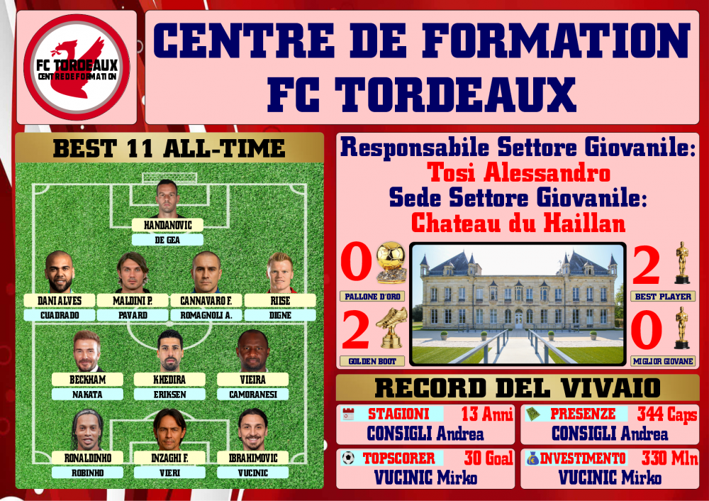 Il Centre de Formation Tordeaux vede la luce nel lontano 2003 con l'obiettivo di scovare, coltivare e crescere calciatori che poi crescendo potevano risultare utili alla prima squadra del club. Le giovanili del club si allenano nella suggestiva cornice dello Chateau du Haillan che in un contesto di metà ottocento che si fonde con la modernità delle strutture dei girondini per la crescita dei giovani prospetti. Le caratteristiche del vivaio girondino sono quelle di produrre grandi calciatori soprattutto per i reparti avanzati ma si può dire che ci sia una certa competenza un pò in tutte le p...
