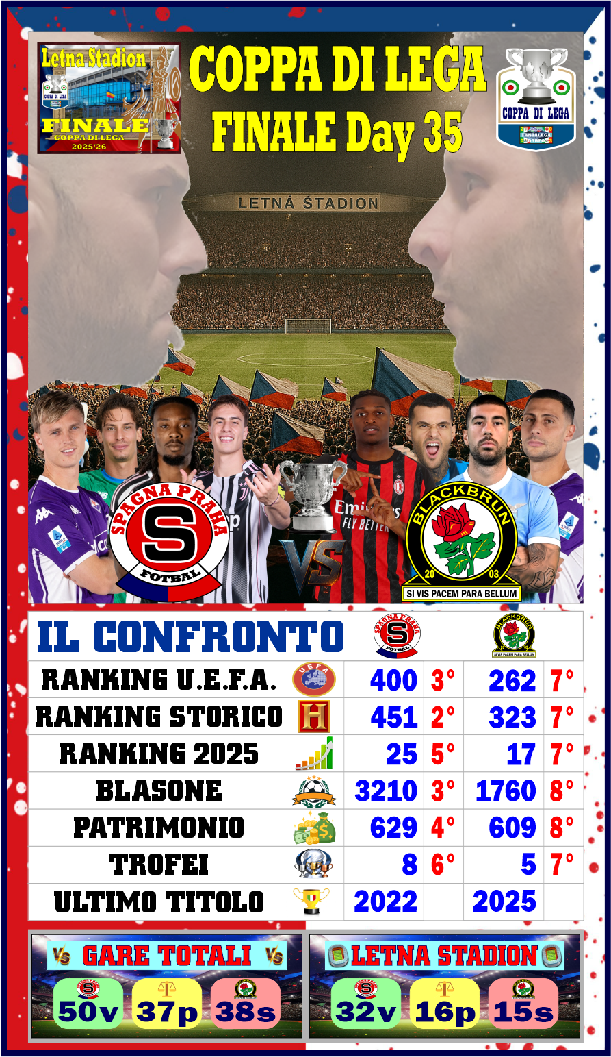 FINALE DI COPPA DI LEGA INEDITO AL LETNA: LO SPAGNA PRAGA OSPITA IL BLACKBRUN