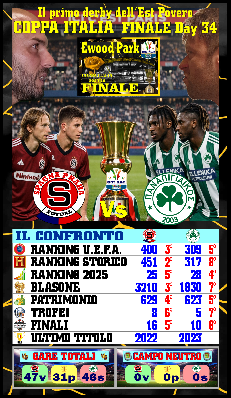 Dopo due semifinali di altissimo livello che hanno visto da una parte lo Spagna Praga dominare in largo e in lungo contro il Teottenham e il Panapigiaikos avere la meglio con più difficoltà sull'Elis Saint Giorgiain abbiamo la certezza di quella che sarà una prima assoluta: a Ewood Park infatti per l'atto finale che metterà in palio la Coppa Italia 2026 si troveranno di fronte Panapigiaikos e Spagna Praga per un derby dell'est povero che sarà una prima assoluta con in palio un titolo. La cosa curiosa è che le due squadre non hanno alcun precedente nemmeno in campo neutro, non si sono mai in...