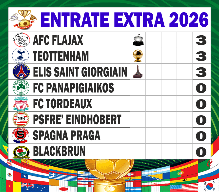 FC PANAPIGIAIKOS - FC TORDEAUX; SPAGNA PRAGA - ELIS SAINT GIORGIAIN; TEOTTENHAM - AFC FLAJAX; PSFRE' EINDHOBERT - BLACKBRUN;