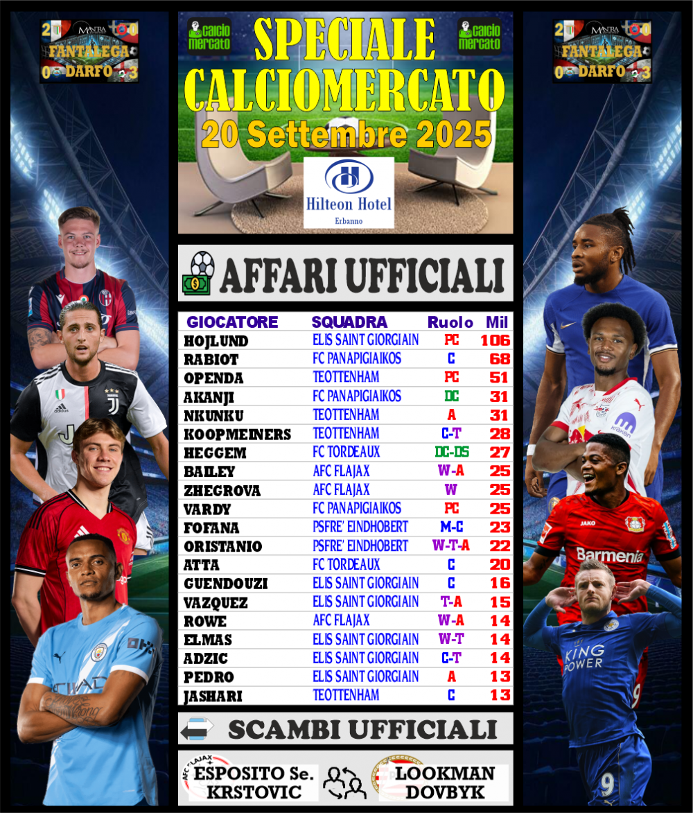 Sabato 20 Settembre nell'amena cornice dell'Hilteon Hotel di Erbanno si è svolta la prima sessione di calciomercato per la stagione 2025/26, presenti tutte le squadre, e c'è soprattutto il debutto ufficiale degli svincoli tramite busta con l'obbligo di consegnare le proprie cessioni tramite un modulo rendendo poi impossibili le cessioni per tutto il primo giro di chiamate, esperimento andato a buon fine che rende più regolari le trattative senza che qualche squadra debba scoprire le proprie carte per prima. Il grande colpo della serata è danese ed è Rasmus Hojlund che finisce all'ESG per la...