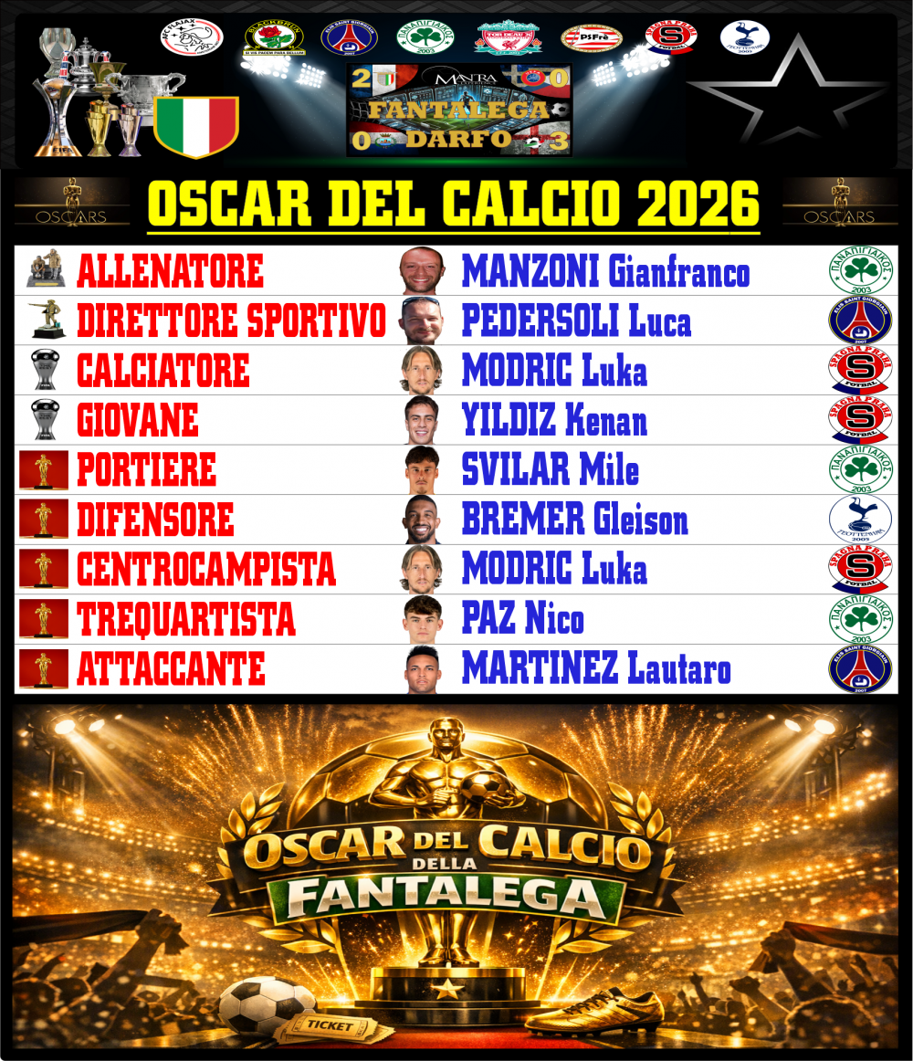 Con l'ultima sessione di mercato come da oramai quasi ventennale tradizione ecco gli Oscar del Calcio della Fantalega che da qualche stagione assegnano anche dei succosi milioni per la stagione successiva ai vincenti delle varie categorie. Il coach dell'anno è nuovamente Gianfranco Manzoni del Panapigiaikos, per il GM greco si tratta della terza affermazione in carriera tutte però compresse nelle ultime quattro stagioni che ha letteralmente dominato e si tratta inoltre della seconda vittoria consecutiva. Il miglior direttore sportivo della stagione è stato particolarmente combattuto e a spu...