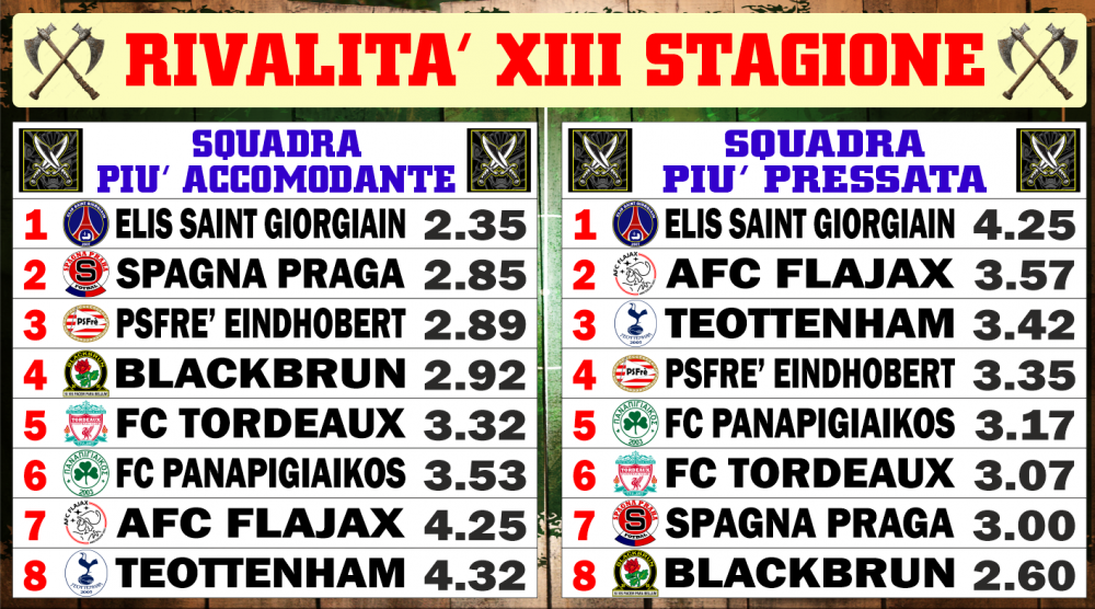 Tempi difficili in casa ESG nonostante quello che doveva essere un nuovo progetto simpatia con l'ingresso del nuovo DS Pedersoli in società il club parigino si ritrova nuovamente ad essere il club con più stelline di rivalità inflitte dagli avversari con l'esorbitante cifra di 4,25, un distacco piuttosto notevole sulla squadra presidenziale del Flajax che ne incamera comunque 3.57 mentre chiude il podio delle squadre più pressate della Lega il Teottenham con 3.42, la squadra che sortisce meno rivalità nuovamente il Blackbrun con sole 2.60 stelline. Il paradosso dell'ESG è che i parigini son...