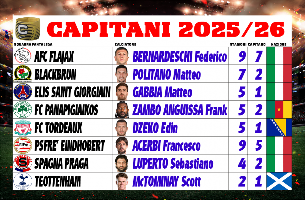 Ufficiale la lista dei capitani per la stagione 2025/26, i suddetti giocatori rappresenteranno le squadre in campo e saranno soggetti al vincolo di non poter abbandonare la rosa della squadra sino al termine della stagione. Per il Flajax c'è un incredibile ritorno con la fascia che torna sul brac...