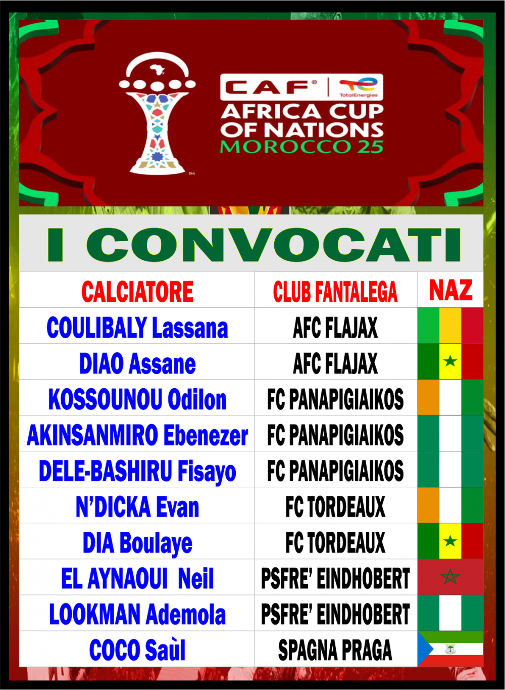 Come una condanna dalla cadenza biennale ecco le convocazioni per la Coppa d'Africa 2025 che si terrà in Marocco a partire dal 20 Dicembre 2025 e che costringerà diversi calciatori della Fantalega a saltare diverse gare in base al piazzamento della propria nazionale nel trofeo continentale. Come da previsione la squadra più colpita è il Panapigiaikos che vedrà tre elementi partire per il trofeo ovvero Kossounou, Akinsanmiro e Dele-Bashiru con il capitano Zambo Anguissa che non parteciperà alla kermesse ma solamente per un brutto infortunio che lo terrà comunque a lungo lontano dai campi. Tr...