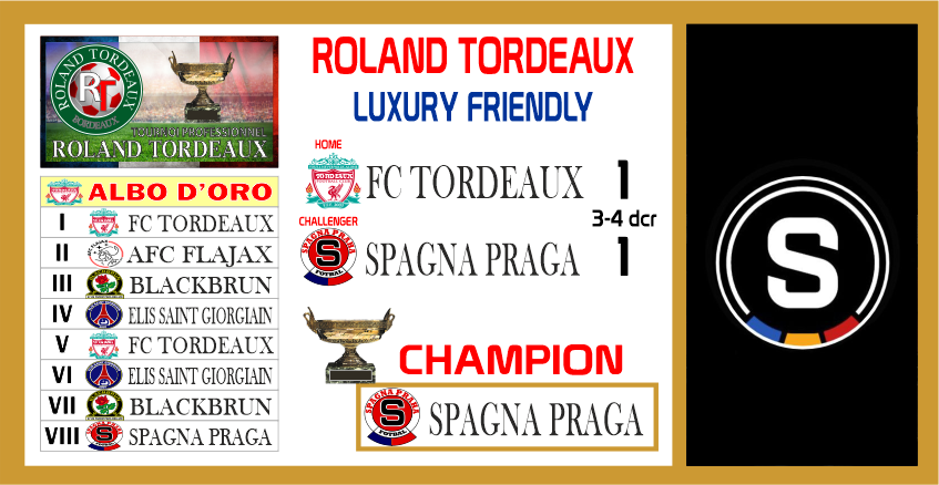 Và agli archivi anche il Roland Tordeaux con la sfida accesa tra i padroni di casa e i cechi dello Spagna Praga. Sfida equilibratissima tra le due compagini con una continua serie di emozioni e i 90 minuti che si chiudono sull'1-1. Servono i penalty per stabilire la squadra che alzerà il trofeo e la differenza la fanno i portieri con Sommer che neutralizza due tiri dal dischetto mentre uno spento De Gea si ferma ad uno consegnando così il suo primo Roland Tordeaux allo Spagna Praga insieme al relativo premio di 3 Milioni. Per i cechi è il decimo trofeo personale della propria storia e sono ...